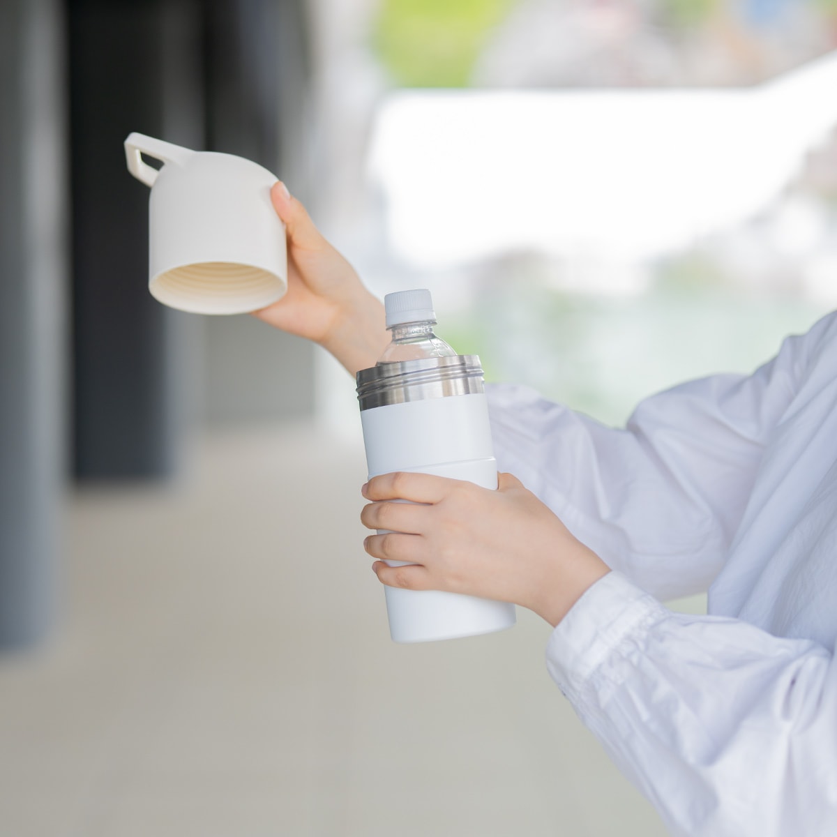 ペットボトルを入れ替えるだけのシンプルな構造は、飲み物が直接本体に触れないので日々のお手入れも簡単です。入れ替えのたびに洗浄する必要がなく、飲み終わったらコンビニや自販機で購入した新しいペットボトルをすぐににセットして保冷(保温)できます。1日に何本もペットボトル飲料を飲むようなときにとても便利です。