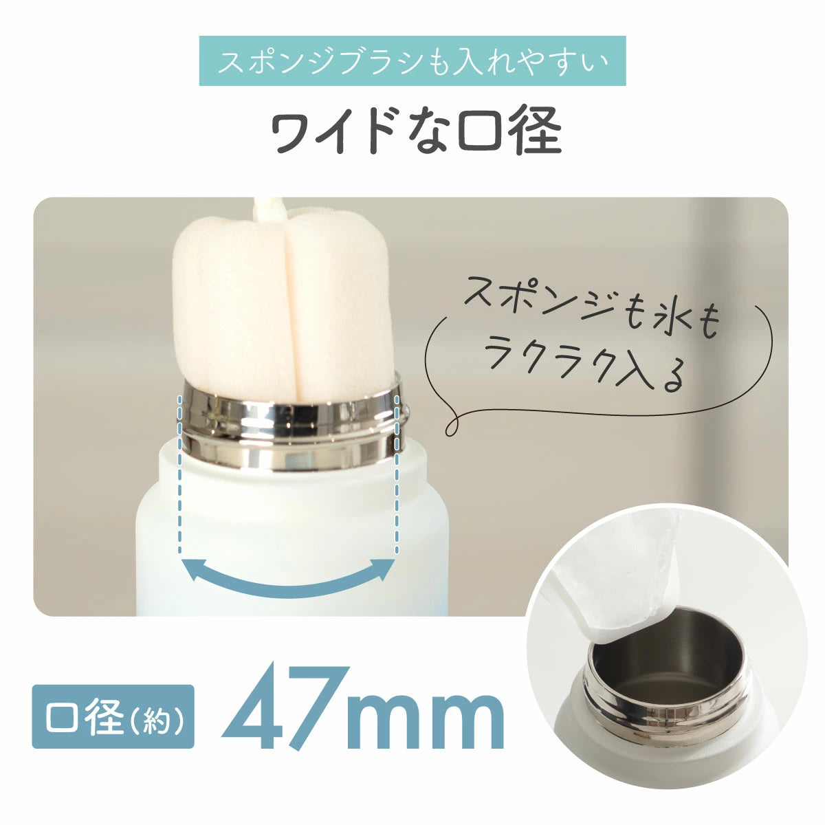 口径は約47mmと広口な設計で、スポンジブラシを入れて洗いやすく、家庭用の氷もラクラク入れることができます。