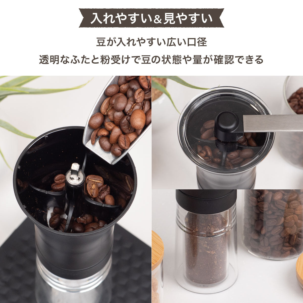 広口のホッパーで豆が入れやすく、透明なふたと粉受けで豆の量や状態が見やすい。