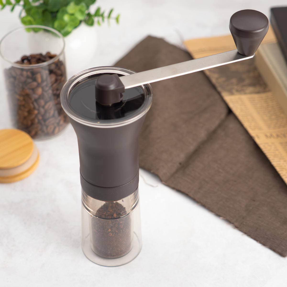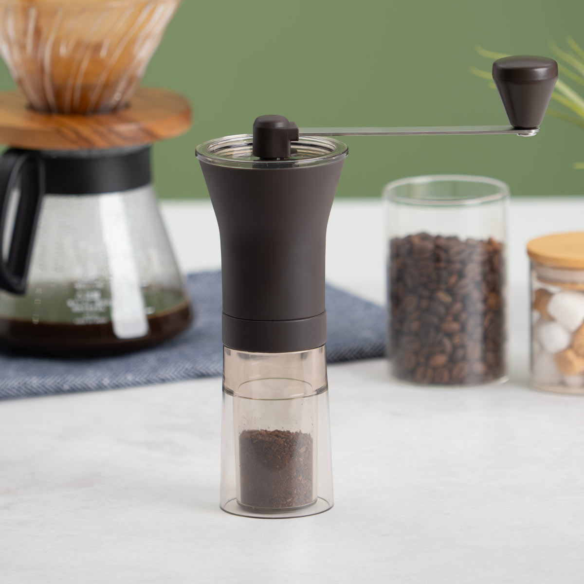 コーヒー豆を入れるホッパーは計量スプーンよりも十分に大きい口径に設計、グリップ部は握りやすい太さにし、さらにシリコンの滑り止めを設けてグリップ力をUP。粉受けは底に向かって緩やかに広がるよう傾斜をもたせているので広範囲で握りやすく、かつ立たせたときに安定する形を実現。フタと粉受けを透明にしているので、豆と挽いた粉の量・粗さを目視で確認できます。コーヒーミルを使うのがはじめてという方でも、挽きやすい・扱いやすい設計に徹底的にこだわりました。