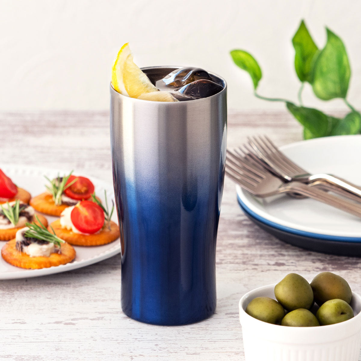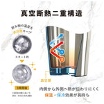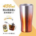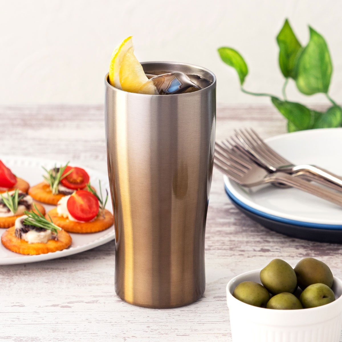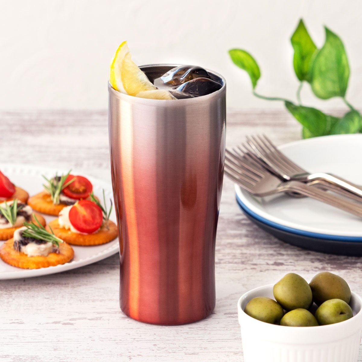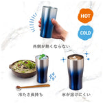 本体の真空層が熱の移動を抑えるので結露しにくく、飲み物の美味しい温度が長持ちします。氷をザクザク入れたハイボール、アイスコーヒー、ジュースなどは氷が溶けにくいため飲み物が薄まらず、最後のひと口まで美味しく飲むことができます。また、ホットドリンクを入れた場合も飲み物が冷めにくく、外側へ熱が伝わらないのでやけどの心配もありません。保温・保冷両用でオールシーズンお使いいただけるタンブラーです。
