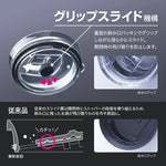 独自の『グリップスライド機構』のふた付きで滑らかにスライド。開閉時の飲み物が飛び散りにくい!