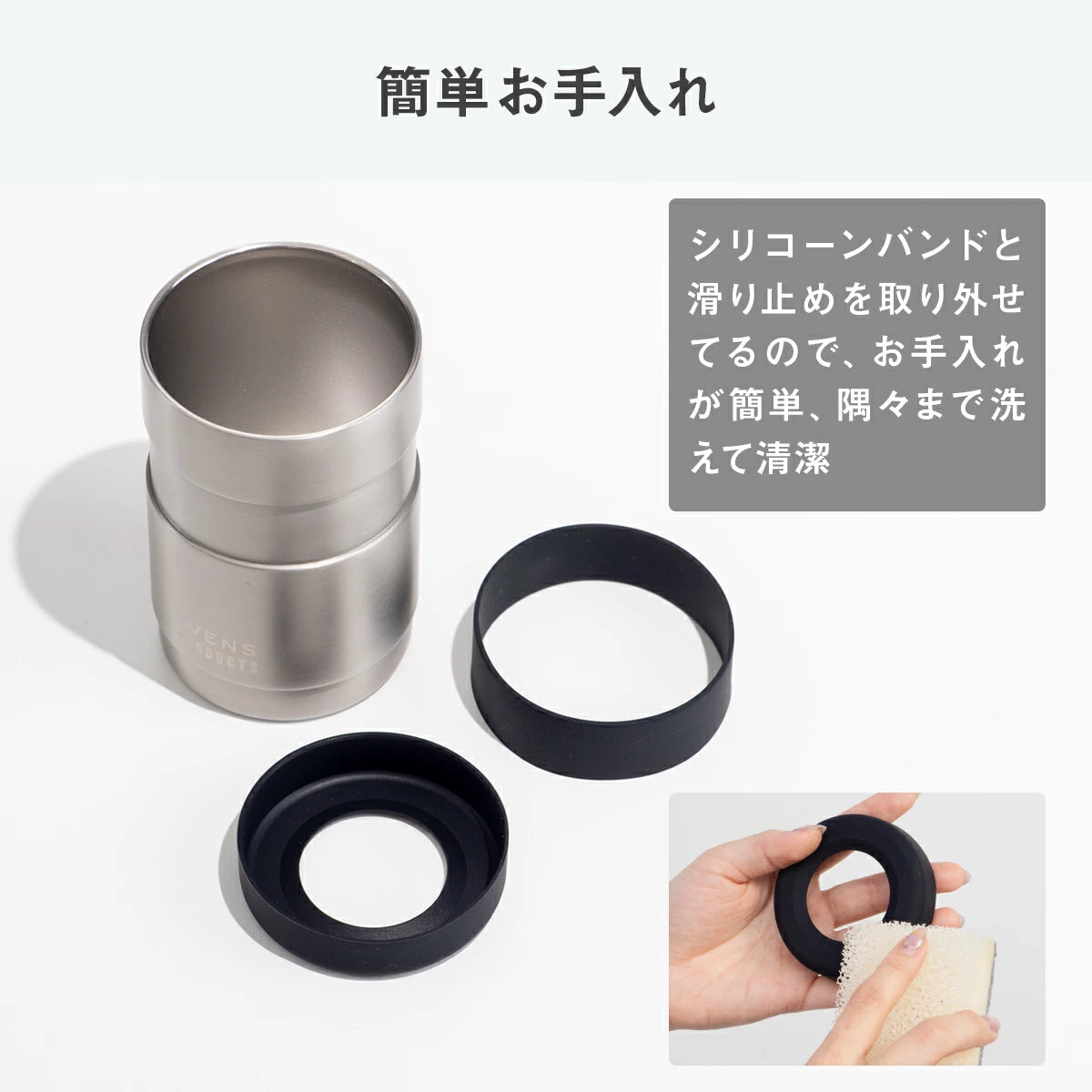 ステンレス製の縁はタンブラー・缶ホルダーどちらの使用でも違和感のない口あたりになるよう設計。また縁から約2.5cm下部分、ちょうど持ち手の指があたる部分にシリコーンバンドを装着、滑りにくく持ちやすい設計にしました。シリコーンは屋外の使用を考慮し底面にも装着、滑りにくいだけでなくキズや衝撃から本体を守ります。持ち手と底部分のシリコーンはどちらも着脱可能のためお手入れしやすく衛生的です。