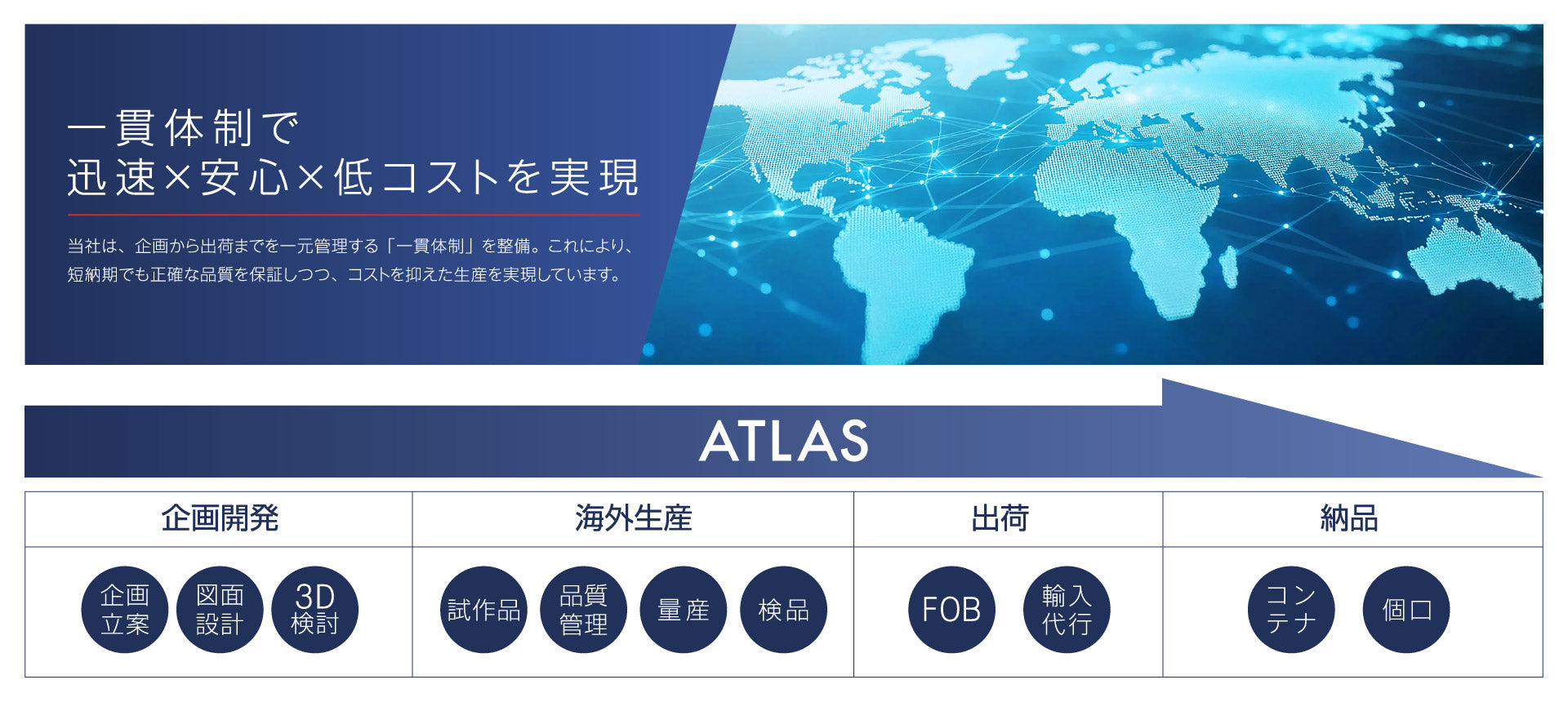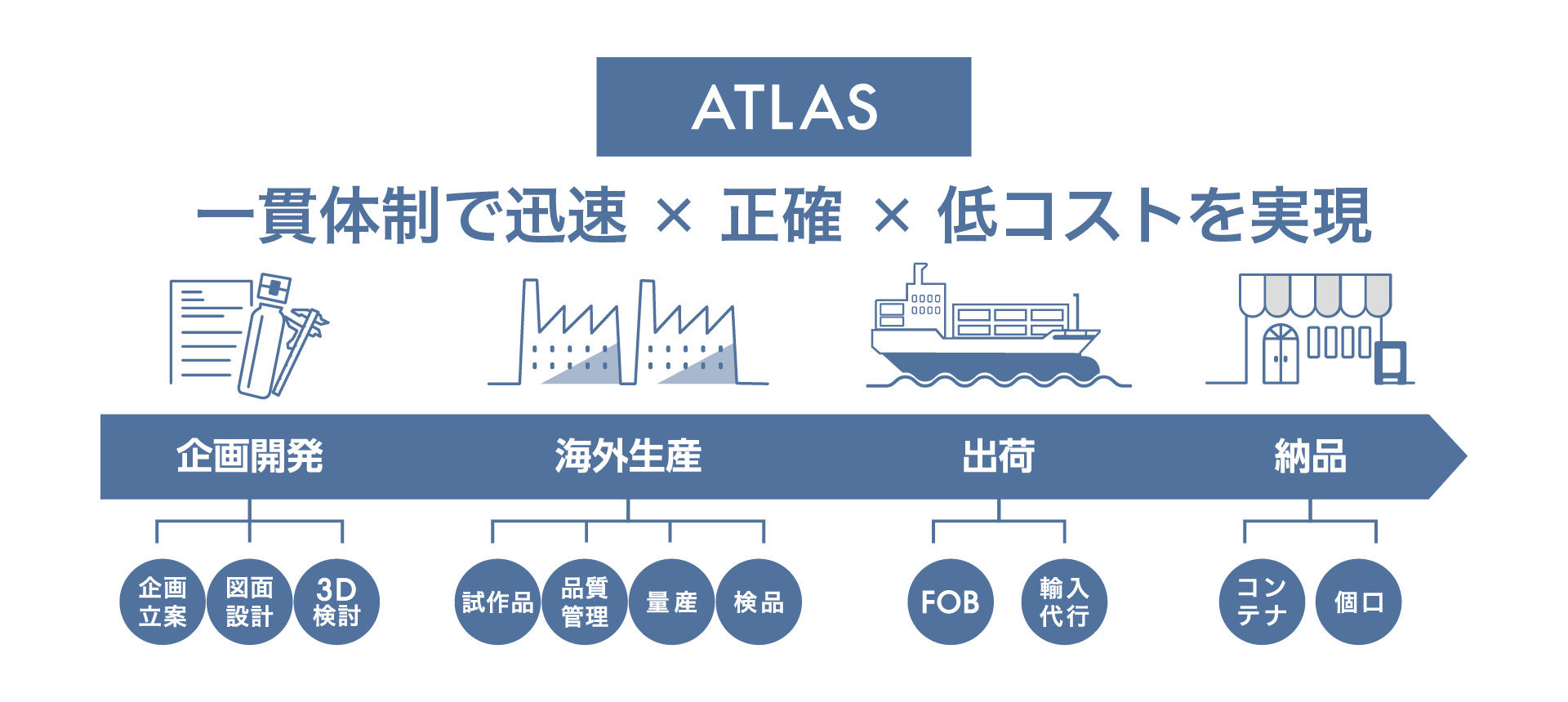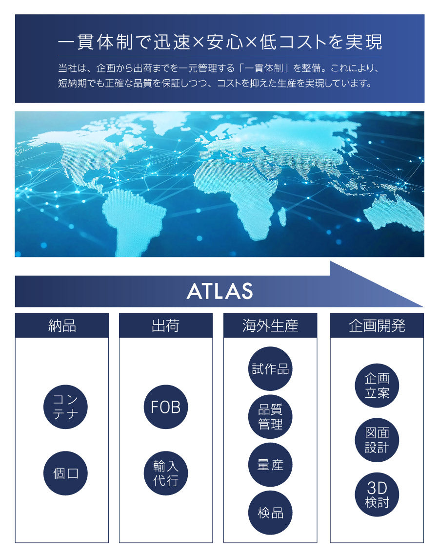 当社は、本当に価値のある商品をお客様の手元へ届けたいからこそ、商品開発で終わらせることはありません。マーケット調査・金型設計・知的財産権管理・工場管理・貿易業務・国内物流・店頭導入までを当社の各分野のプロフェッショナルが対応し、競争力のある商品をお取引先様のブランドでご提供いたします。自社一貫体制のアトラスだからこそ、スピーディーかつ正確で安全なお取引を実現いたします。