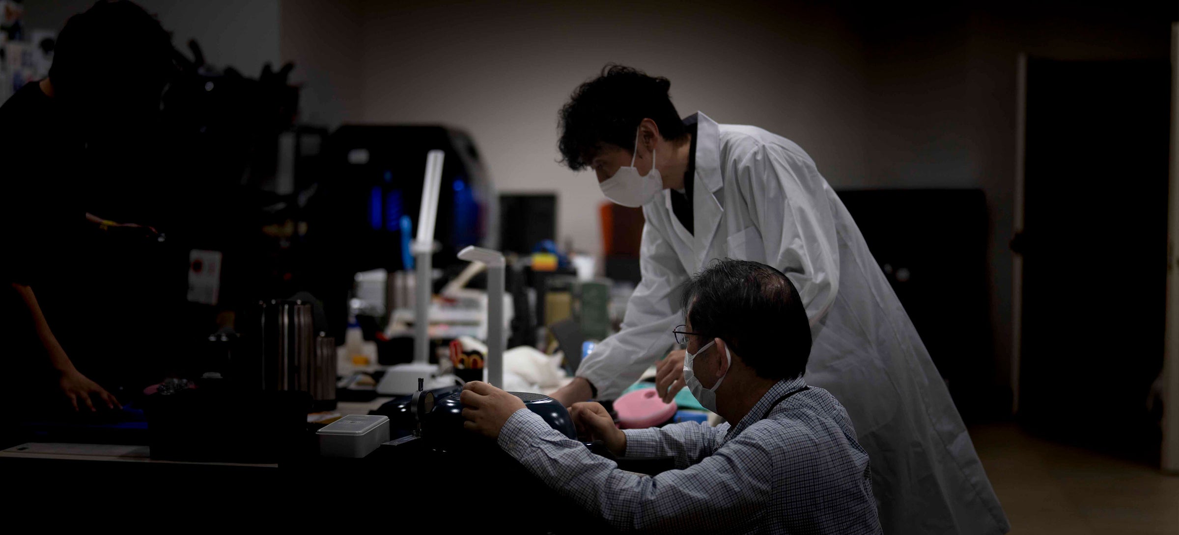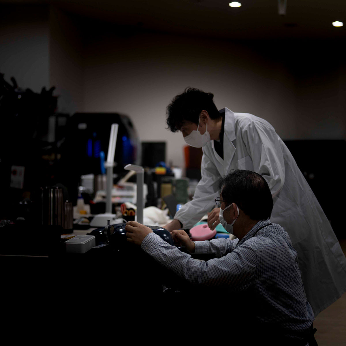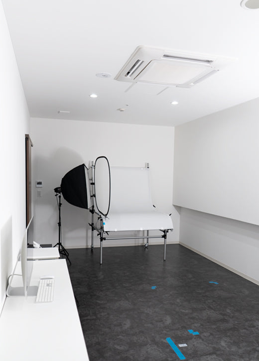 物撮り用の暗室。撮影台、ストロボ、確認用PCなどを備えています。