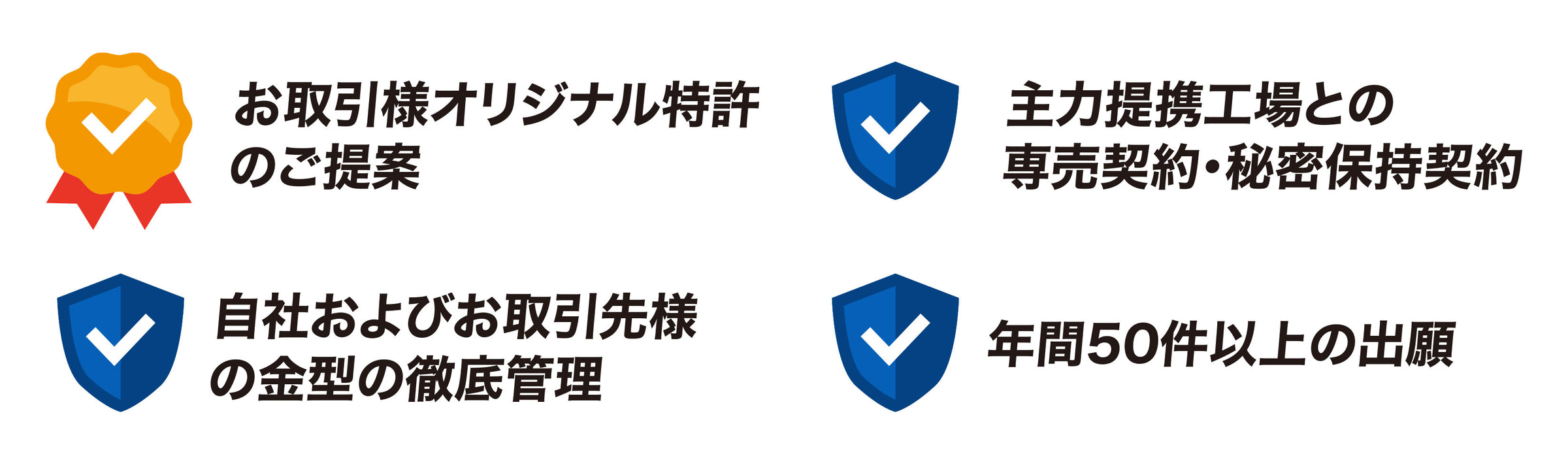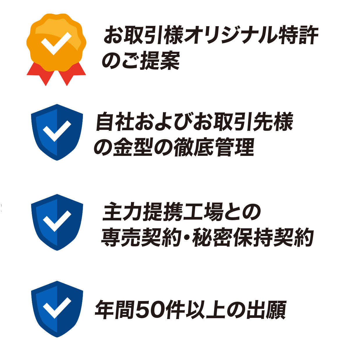 特許権、実用新案権、意匠権、商標権、著作権といった権利を掌握し、抵触のリスクを回避しながら市場競争力のある商品の開発が可能です。当社では年間50件以上の知的財産権の出願を行なっており、機能・デザインで数々の権利を保有しています。また、商品ラインナップのうち自社金型で製造した商品が9割以上にのぼる当社では、複数の提携工場のうち主力の工場とは日本国内での専売契約を締結。さらに金型・デザインなど意匠情報の漏洩が起こらないよう秘密保持契約を締結し、自社金型を徹底管理しています。