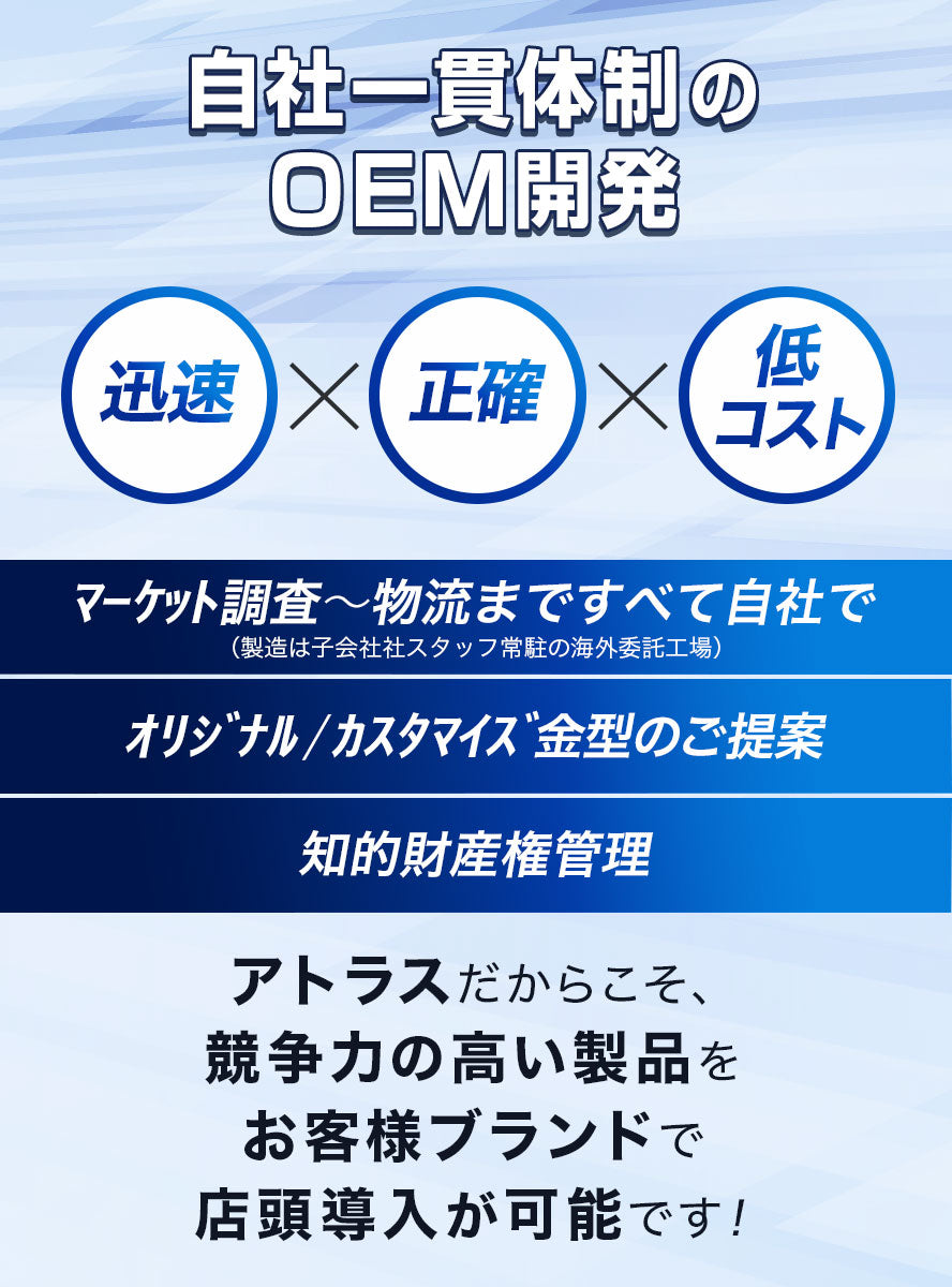 アトラスは精度の高い設計技術、知的財産権管理、生産現地に自社検品システム及び物流機能をもちあわせた一貫体制でOEMの生産受注を受けており、多くの企業様と継続的なお取引をしています。