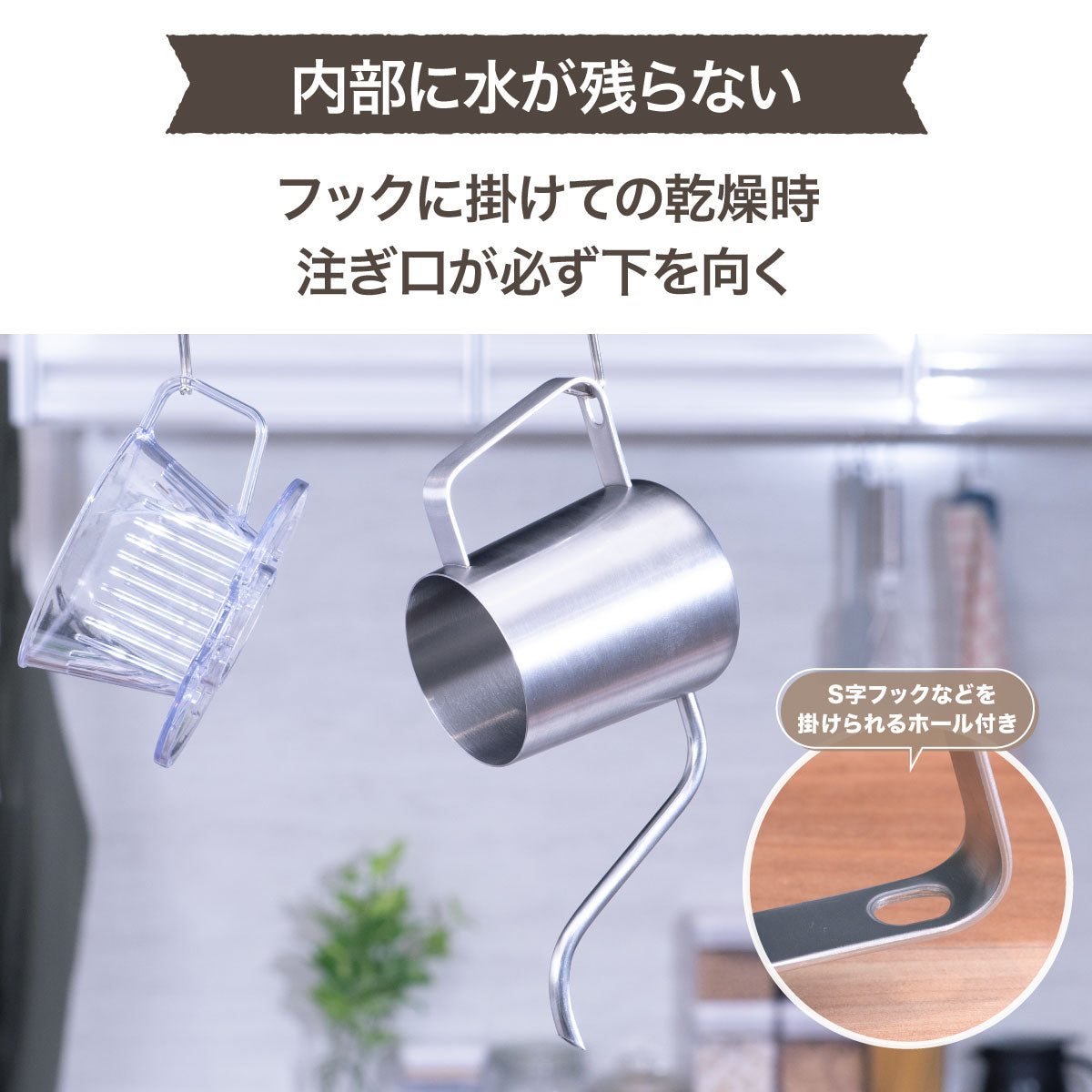 取っ手にS字フックなどを掛けられるホールを備えているので、干しやすく収納にも便利です。フックに掛けての乾燥時には注ぎ口が必ず下向きになる設計で、ポット内部や注ぎ口に水がたまることがなく、清潔さを保ちます。さらに、取っ手の接合部分はレーザー溶接で凹凸がなくスムースな仕上がりなので、スポンジだけでさっと洗えてお手入れが簡単です。