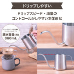 ドリップポットの本体形状には、コーヒーの味わいを自在にコントロールできるよう細かな工夫が施されています。細いネックはドリップスピードや湯量をコントロールしやすく、味の濃さや苦味、酸味など、好みの味を実現することが可能です。注ぎ口の形状は、注ぎやすさと見やすさを重視して設計された斜めカットデザインで、狙った場所にピンポイントでお湯を落とすことができます。また、注ぎ口が水面より高い設計なので、ポットを傾ける角度を最小限にでき、お湯が少なくなってきても一定のペースで安定して注ぐことができます。そのため、一度に注ぐ量が多すぎて味が濃くなりすぎたり、一定のスピードで注げずムラができ、味のバランスが崩れてしまうといったドリップ時の失敗が少なくなります。さらに、ハンドドリップの理想の抽出時間は2分~3分と言われているので、お湯が2分以内に注ぎ切れるペースになるよう設計しました。抽出時間が長すぎると過剰な苦味が出てしまい、味が重たくなりがちなので、苦味と酸味のバランスが保たれたスッキリとしたコーヒーを抽出できるようサポートします。満水容量が約360mLで、コーヒーカップ約2杯分のコーヒーを一度に抽出することができるため、ちょっとしたおもてなしにも便利です。細口で湯量をコントロールしやすく、狭いスペースでも狙った場所に正確にお湯を注げるので、口の狭いドリップバッグにも適しています。
