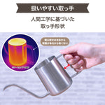 下辺が長い台形型の取っ手は、軽く握るだけでドリップに適した角度になるため、初心者でも簡単にドリップが可能です。さらに、熱いポット部分と指が当たらないように距離がある設計にしています。