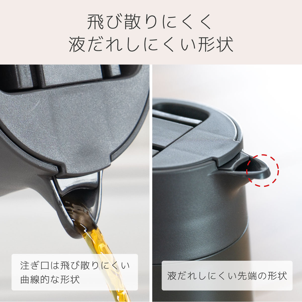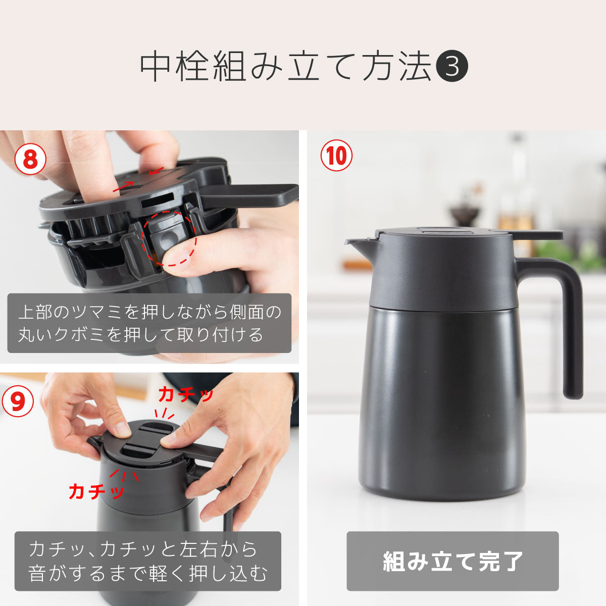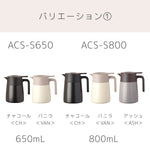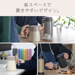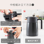 中栓や流水路まで簡単に分解できるため、コーヒー汚れや水垢をすみずみまで洗浄できて衛生的に使えます。ハンドル付近のレバーを押すだけで圧抜きし、噴き出しを防止。片手でも注ぎやすく、丸みのある注ぎ口で水流がなめらかになり、水滴が飛び散りにくい設計です。内瓶はクリーンミラー加工で汚れやにおいが付きにくく、お手入れも簡単。広口設計で直接ドリップも可能です。真空断熱二重構造により高い保温・保冷性能を備え、容量は650mL・800mL・1100mLの3種類。コーヒーを美味しく飲むための工夫が詰まった本製品は日常に、快適なコーヒー時間をお届けします。