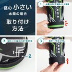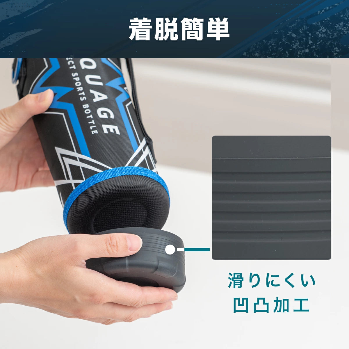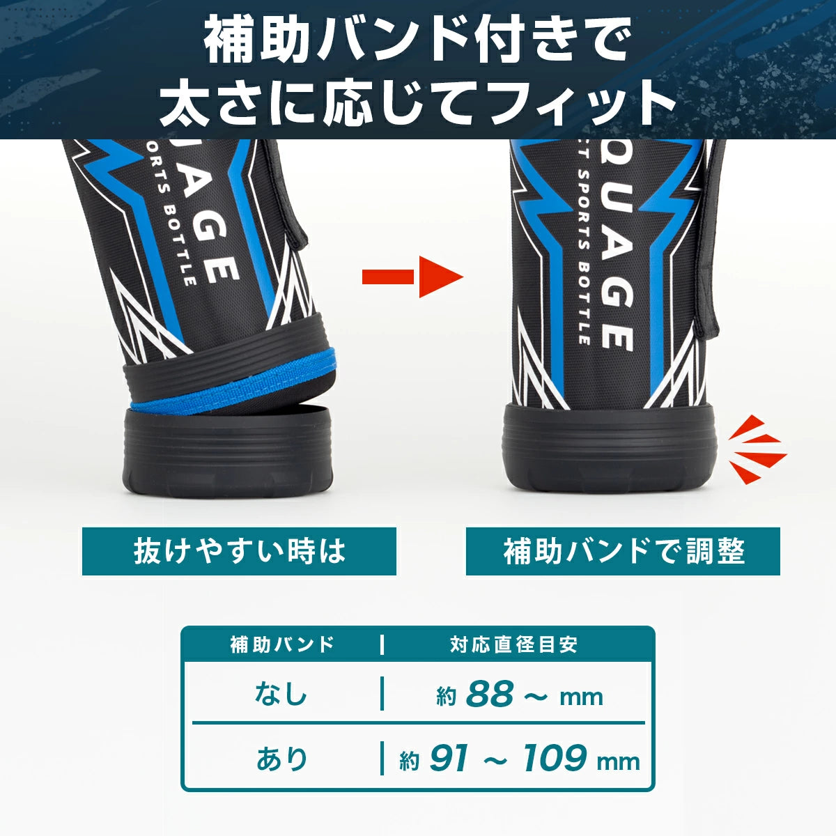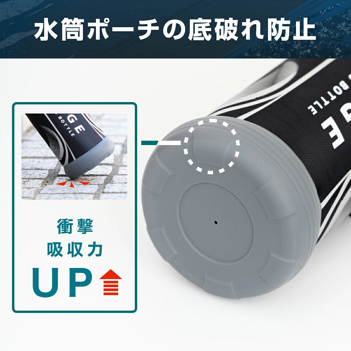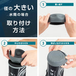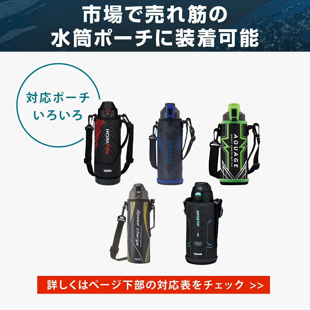 入念な市場調査により、本製品は売れ筋のポーチ付き水筒への対応を実現しました。伸縮性のあるシリコーンゴム素材に加え、付属の補助バンドでお使いの水筒ポーチに合わせてフィット感を調整することもできます。装着できる水筒ポーチの直径目安は約88~105mmと幅広く対応しています。