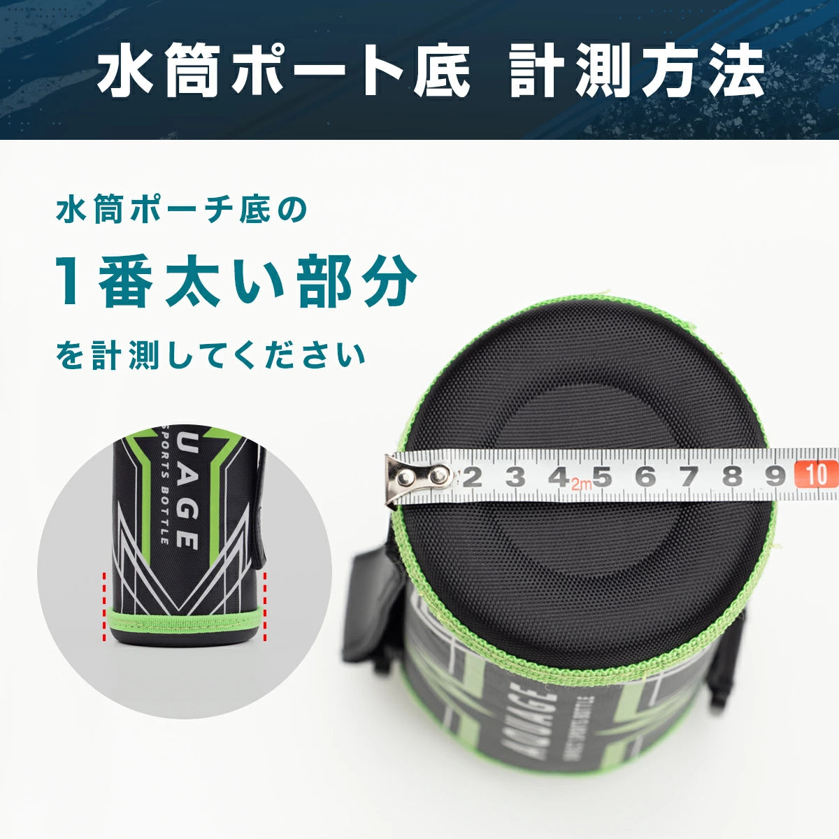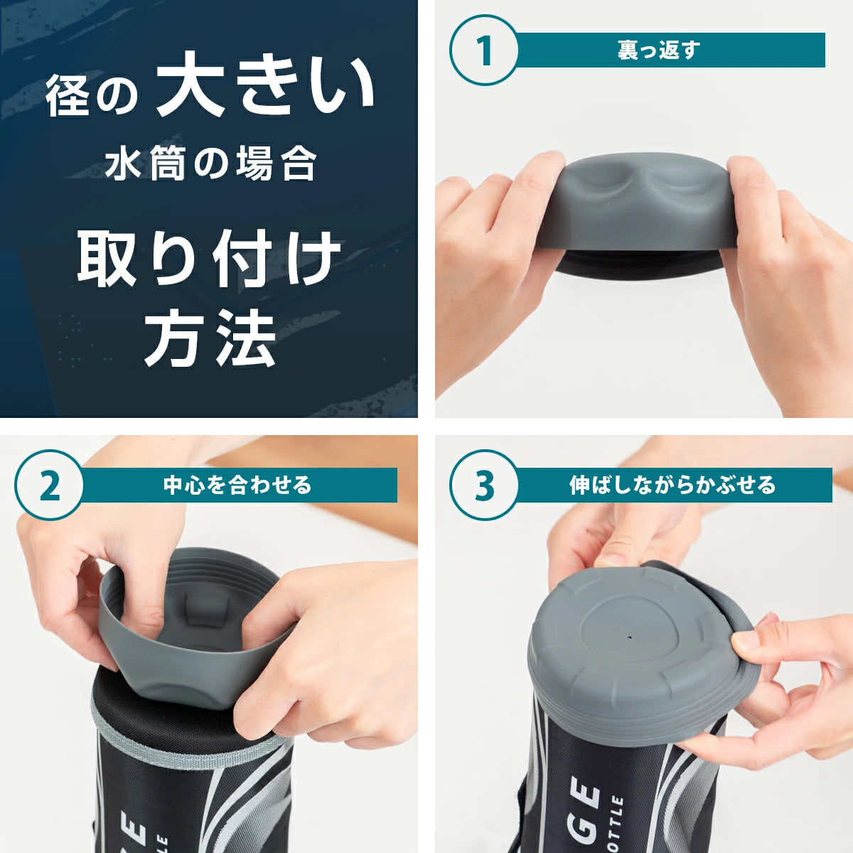 底ガードの内径よりも小さい水筒ポーチの場合、予め水筒ポーチ下部に補助バンドを取り付けた後、その上から本製品を被せるように装着します。底ガードの内径よりも大きな水筒ポーチの場合、一度本製品を裏返し、水筒ポーチの底面と底ガードの中心を合わせてから本製品を引き延ばしながら再度裏返すように装着してください。