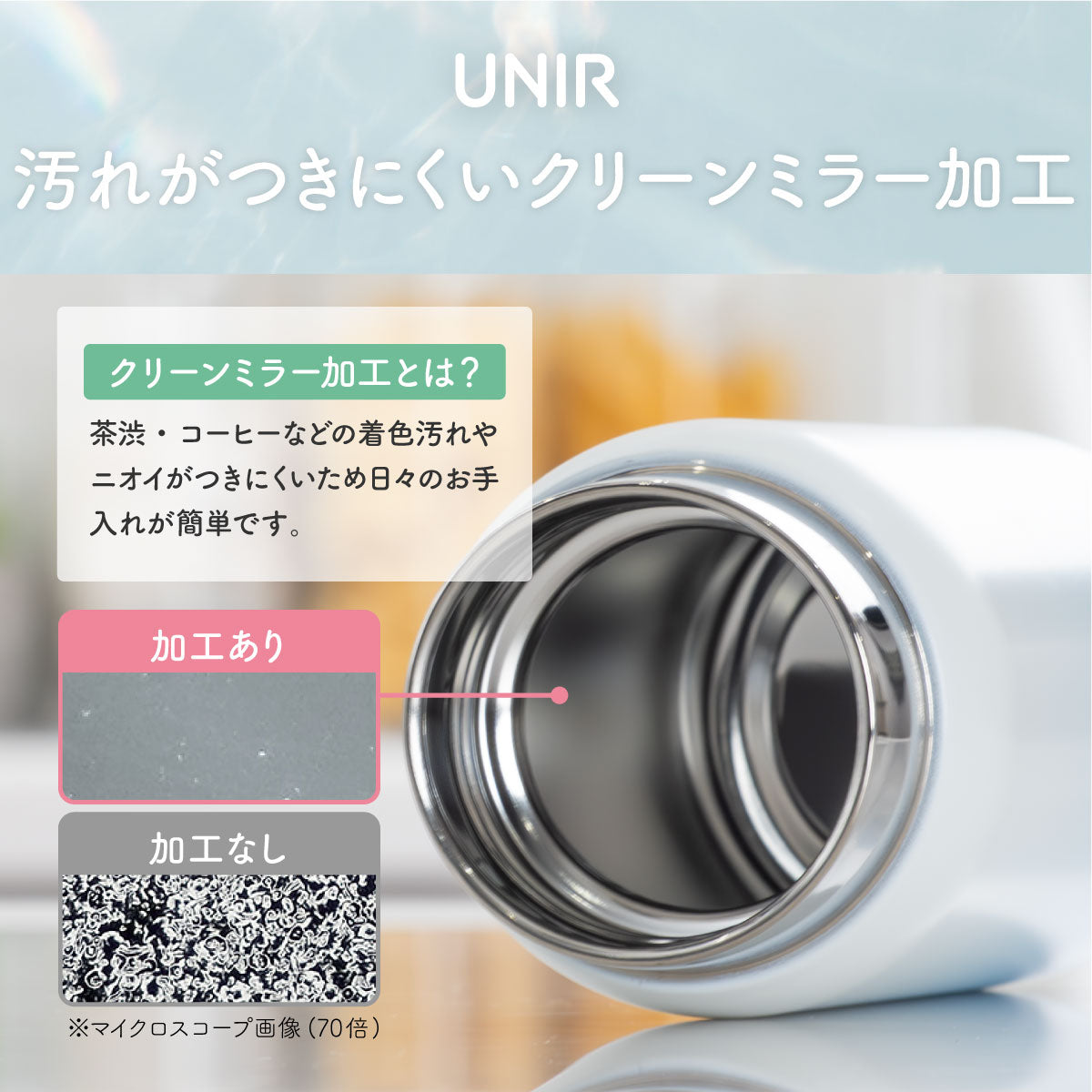 内びんにはクリーンミラー加工を施すことで表面がなめらかで汚れやニオイが付着しにくいため、日々のお手入れがとても簡単です。コーヒーや紅茶などを水筒に入れた際のニオイや着色汚れを、最小限に抑え清潔にお使いいただけます。また、スポーツドリンクにも対応しているのでスポーツやフィットネス、レジャーなどのアクティブシーンでの使用にもおすすめです。