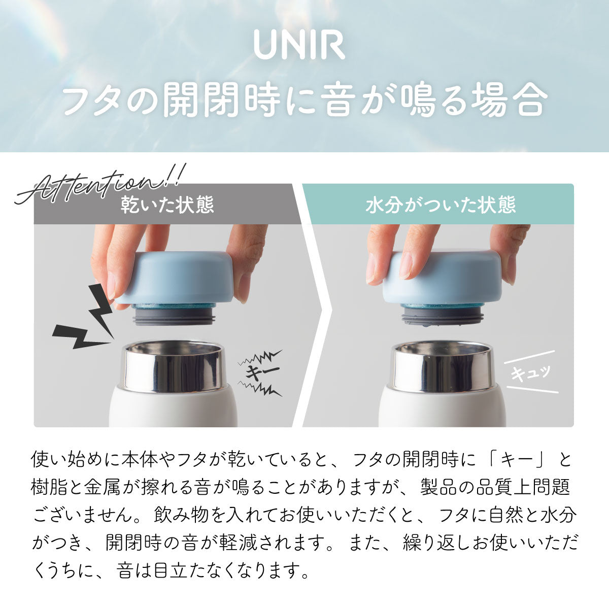 本製品は開閉のしやすさを重視し、最小限の回転数で開閉できるダブルねじ構造を採用。ねじの開始地点を2ヶ所設けることで、噛み合わせが良くなり素早く開閉可能です。また、中栓がフタより約1.2cmほど高く設計されており、フタ裏に付着した水滴を飲み口のフチで切りやすくなっているので水滴が衣服やデスクに垂れることを防ぎます。