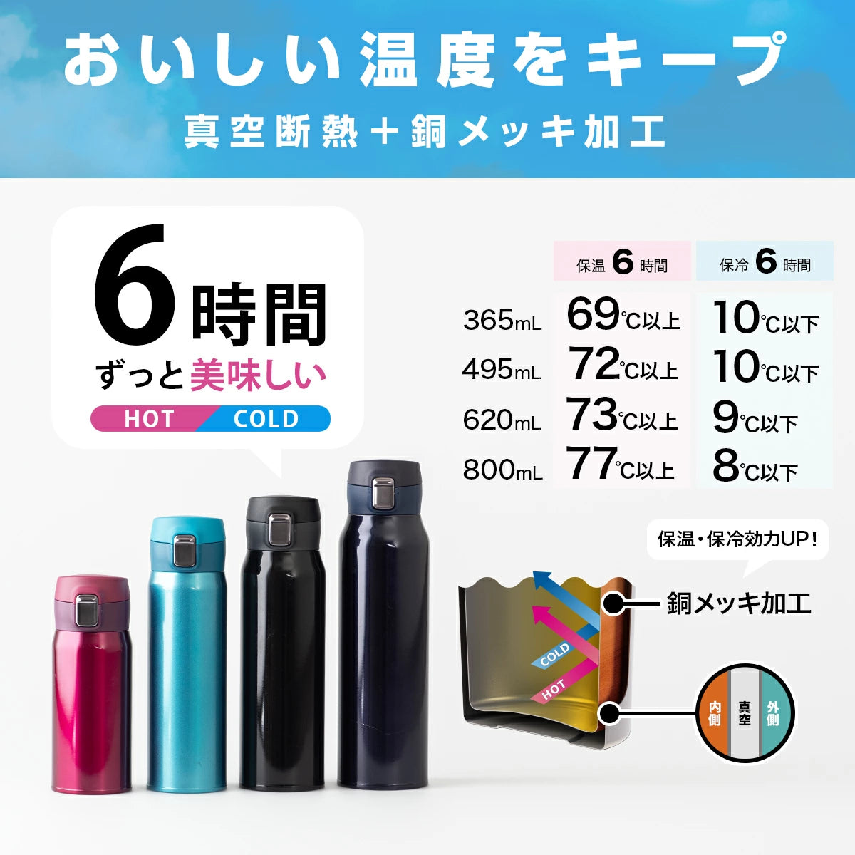真空断熱構造+銅メッキ加工で保温・保冷効果が長持ち。