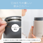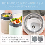 本製品は300mlサイズで本体重量が約185gと気軽に使える軽さに仕上げました。 内びんにはフッ素樹脂コーティングより、においが少ないクリーンミラー加工を施しました。 飲み口には口当たりの優しいシリコーン素材のカバーを採用。 ープなども注ぎやすい約50mmの広口です。は真空断熱二重構造と本体内びん外装設計への銅メッキ加工により、保温・保冷性能にも配慮しています。 スープやデザート、パスタなど、メニューに合わせて選びやすい3サイズ(300ml/350ml/540ml)からお選び頂け、充実のラインアップです。