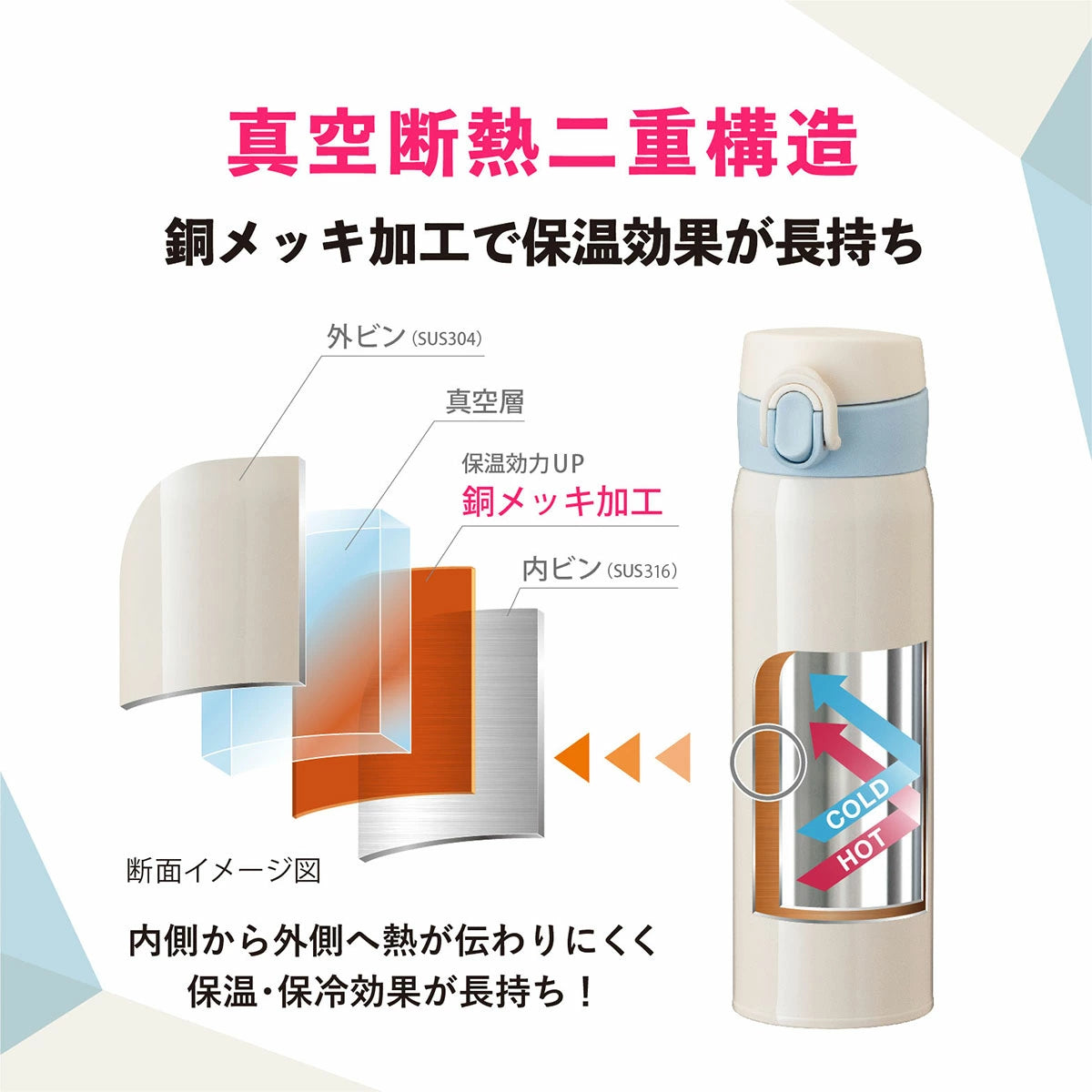 真空断熱二重構造により外気の影響を受けないため、優れた保温・保冷機能が特徴です。内びんに銅メッキ加工を施すことでさらに保温・保冷効力がUP !アツアツの飲み物は温かいまま、冷たい飲み物はひんやり温度が長持ちします。