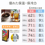 ※保温(保冷)効力とは、室温20℃±2℃において製品に熱湯(冷水)を口金の下端まで入れ、湯温が95℃±1℃(4℃±1℃)になったとき、キャップをして縦置きにした状態で6時間放置した場合におけるその湯(水)の温度です。