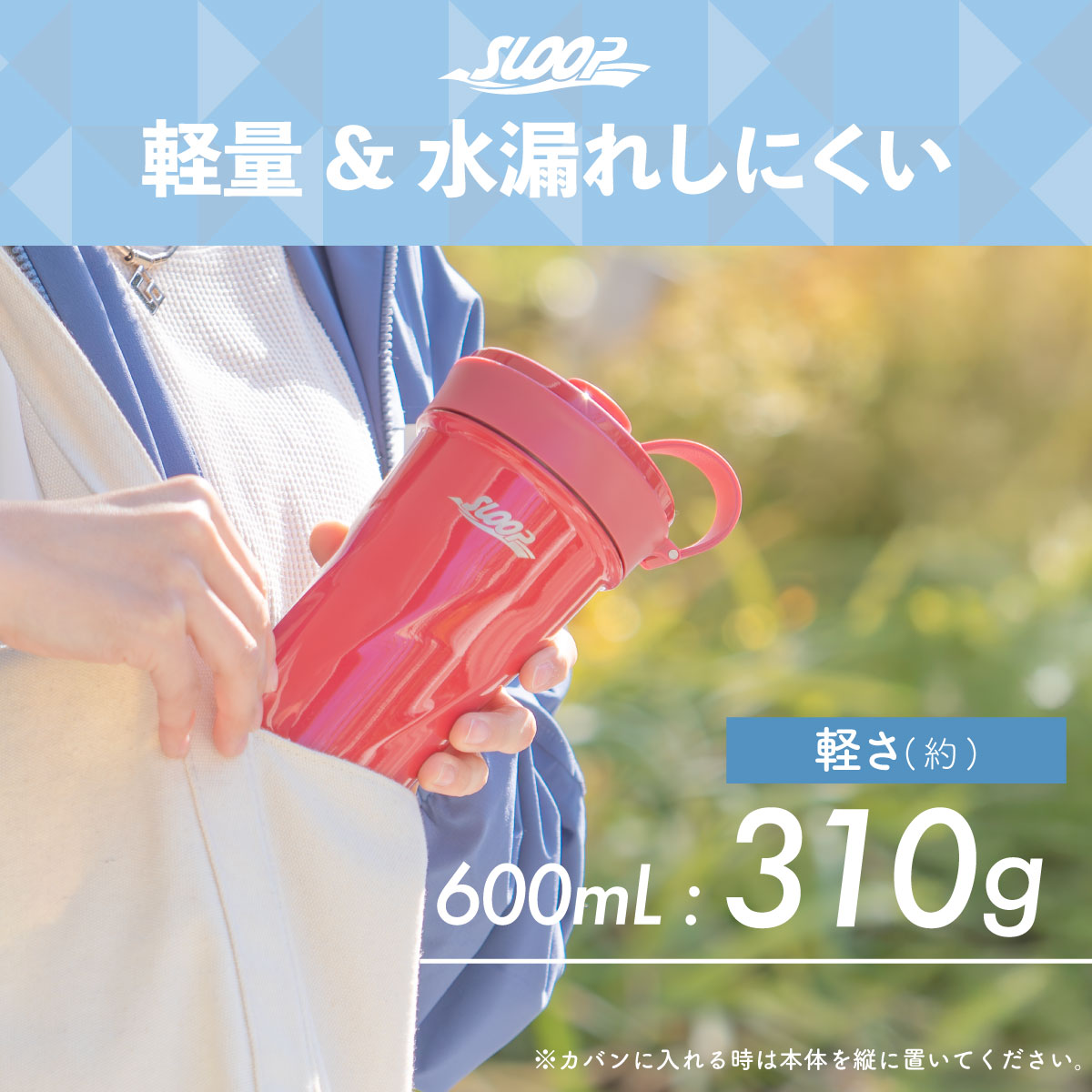 パッキンの密閉性が高く水漏れしにくいため、カバンに入れての持ち運びが可能です。軽さも約310gと軽めなので持ち歩く時も負担になりません。