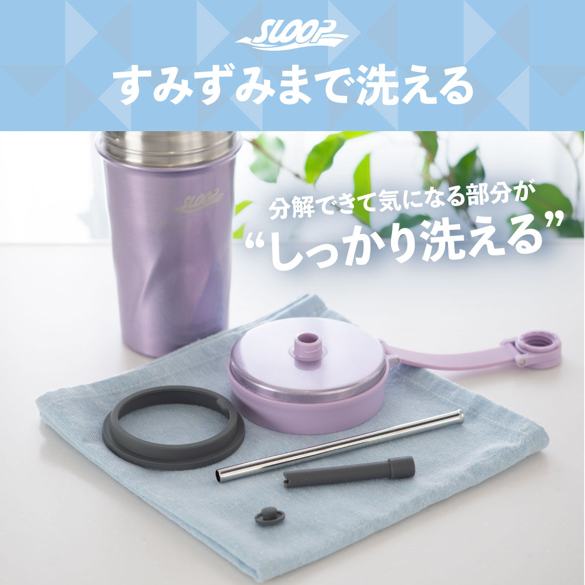 パーツが分解可能な構造のため、細部まで洗浄できて衛生的です。ストローは細いブラシでのお手入れがおすすめ。※細いブラシは付属しておりません。