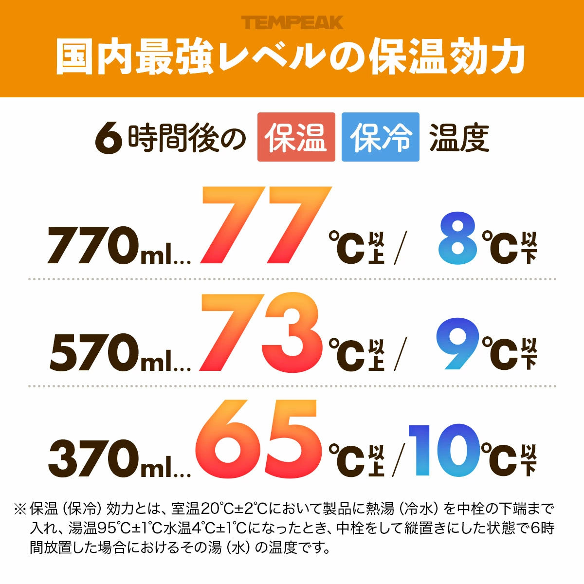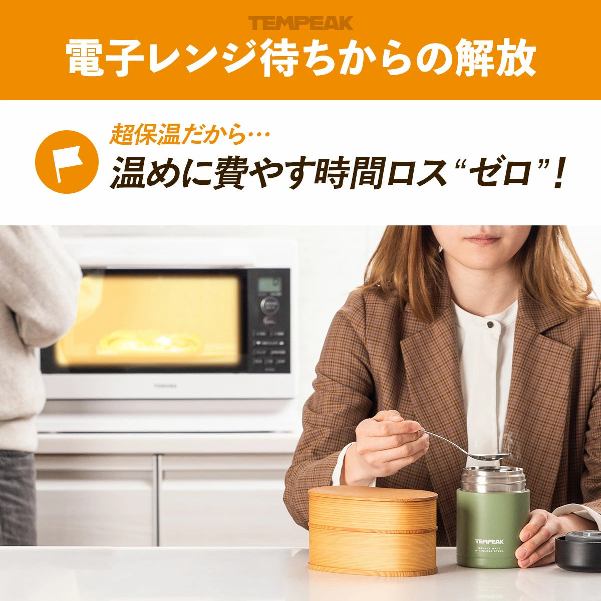 本製品はTEMPEAKシリーズの最大の特徴である【5層の断熱構造】と断熱材入りの中栓で6時間後も77℃以上(770mlの場合)という他に類を見ない保温効力を発揮。食材が傷みにくい超保温力で料理を持ち運ぶことができるので、普段のランチでもできたてのような満足度の高い食事を楽しむことができます。扱いやすさ、洗いやすさにもこだわった思いやり設計で毎日のお弁当の負担を軽減します。普段使いだけでなく、登山飯やキャンプ飯の保温にもおすすめです。※2024年10月 JIS S 2006:2019で定められる検査方法に基づく自社保温検査による