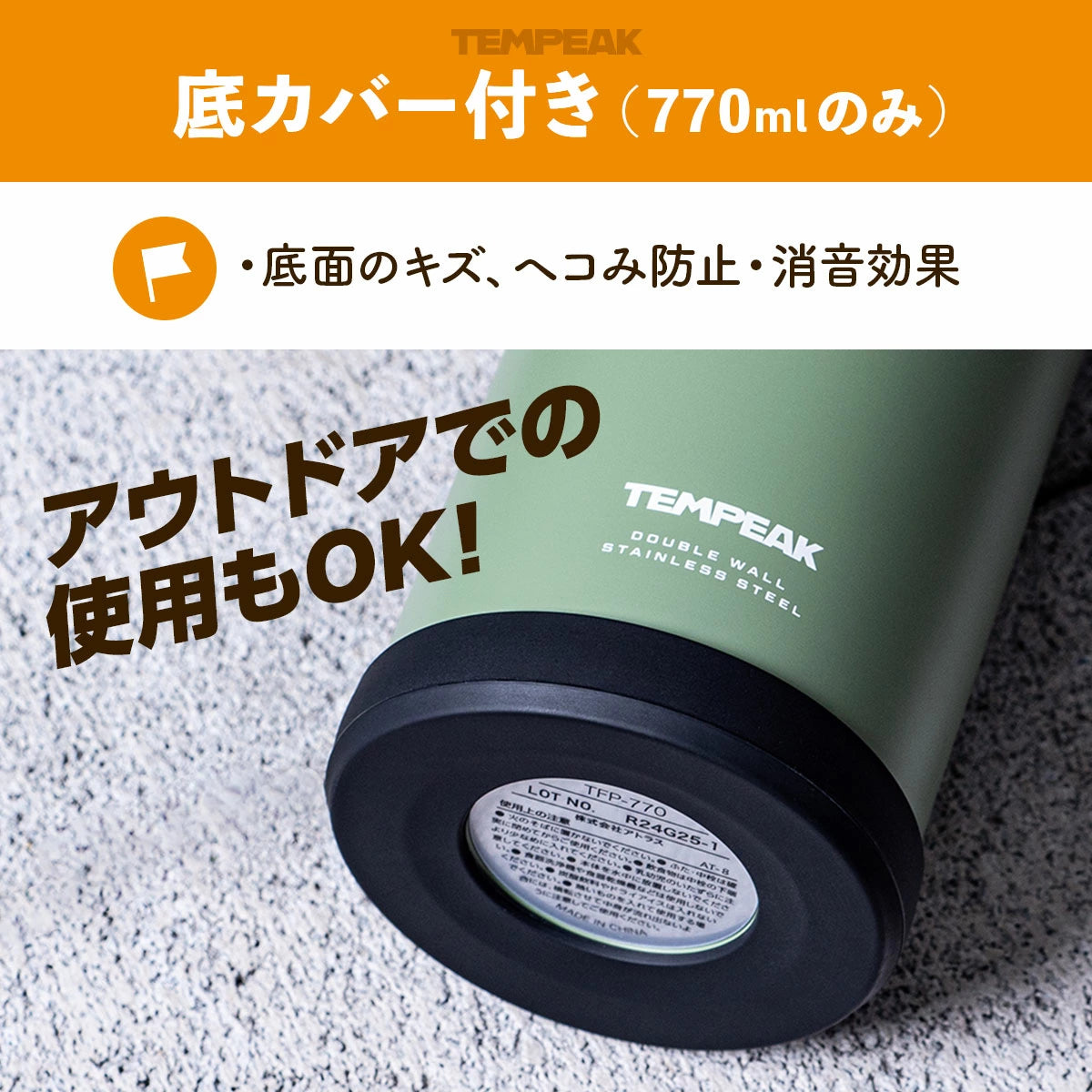 770mlには着脱可能なシリコーンゴム製の底カバーが付いています。底カバーは屋外使用時、底面のキズ付き・凹み防止・滑り止めとして役立つほか、静かな休憩室でのランチ時にはテーブルに置いた際の消音効果も発揮します。