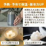本製品の超保温力をより効果的にお使いいただくために、料理を入れる前の本体の予熱・予冷がおすすめです。本体に1/3程度熱湯または冷水を入れ、1分程予熱・予冷をすると保温・保冷効力がぐんと高くなります。ごはんは炊きたて熱いものを、スープはアツアツのまま満タンに入れると6時間後もできたて温度で食べることができます。※中栓の下端-1cm程度まで。入れ過ぎにはご注意ください。