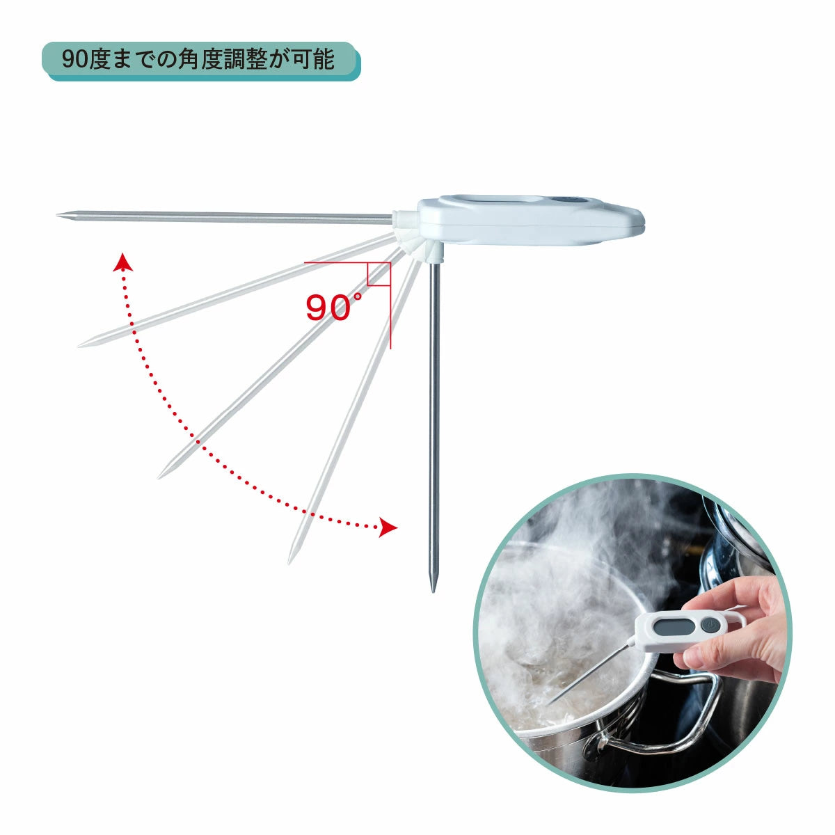 検温部は90度まで角度調整が可能なため、温度表示部が見やすい角度でお使いいただけます。また、鍋から立ち登る熱い湯気や油はねから手を遠ざけて計測できます。
