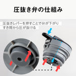 本製品には圧抜き弁が付いており、レバーを押すことで内部の圧抜きができます。密閉性のある容器は熱湯等を入れた際に内部の圧力が上がり、レバーが押せなくなったり、蓋が開かなくなることがありますが、圧抜き弁があることでスムーズに操作できます。また、内圧による中身の噴き出しも軽減します。
