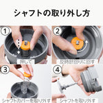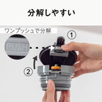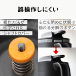 フタ(中栓)はワンプッシュで分解でき、シャフトカバーも押し回すだけで簡単に取り外せます。操作方法が印字されておりスイッチやシャフトカバーのパーツの色が異るため、分解時に操作する箇所が一目で分かります。またフタを閉めた状態ではスイッチが隠れるため、使用時に誤って分解する心配もありません。