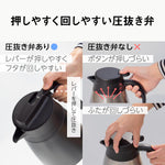 片手で楽に注げるワンタッチレバー式を採用。内びん形状の工夫により中身が残りにくく、最後までしっかり注げます。