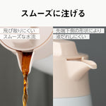 片手で楽に注げるワンタッチレバー式を採用。内びん形状の工夫により中身が残りにくく、最後までしっかり注げます。 さらに、直線的な形状の注ぎ口が飛び散りにくいスムーズな水流を生み出し、先端下側をわずかにカーブさせることにより液だれもしにくいため快適に注げます。