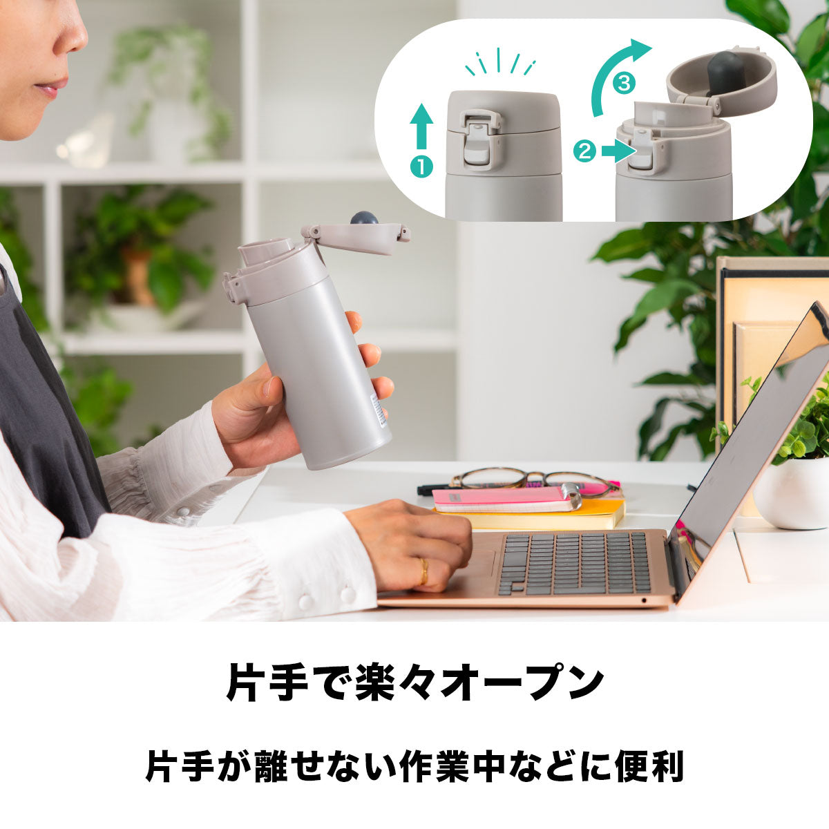 安全ロックを上げて片手で開けられるワンタッチタイプです。小さな動作でサッと開閉ができるため、運動の合間や通勤・通学、片手が離せない作業中など、スムーズな水分補給をしたい場面に便利です。