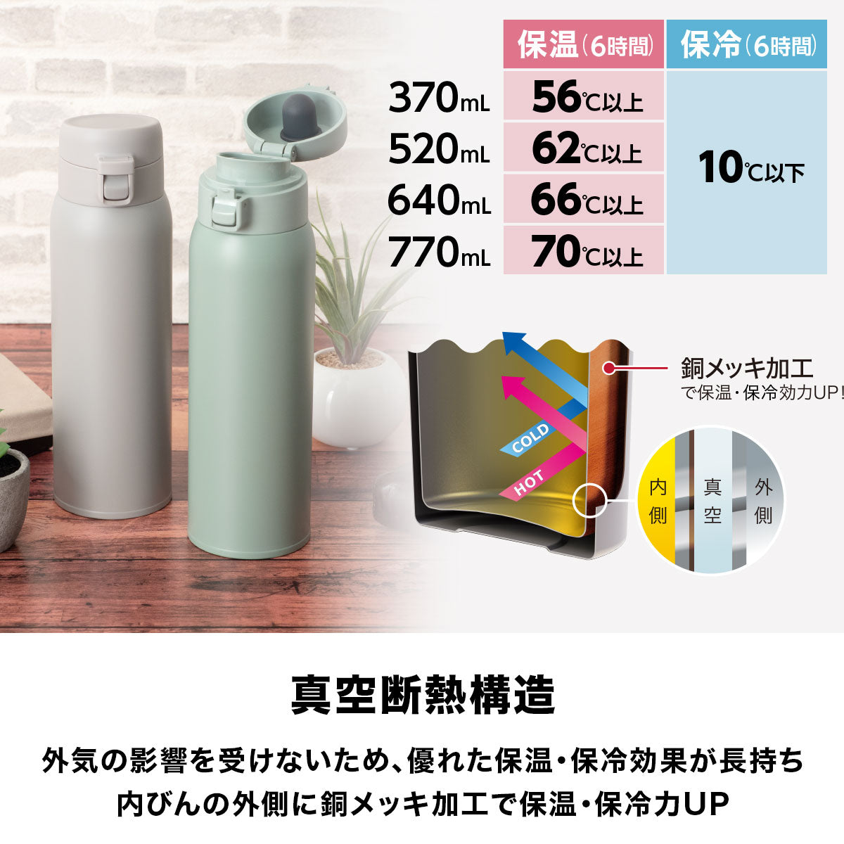 真空断熱二重構造により外気の影響を受けないため、優れた保温・保冷機能が特徴です。さらに内びんの外側に銅メッキ加工を施すことで保温・保冷効力が向上。アツアツの飲み物は温かいまま、冷たい飲み物はひんやり温度が長持ちします。
