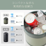 用途に合わせて選べる2サイズ展開。2.6Lは氷約1kgまたは350mL缶3本、4.0Lは氷約2kgまたは350mL缶6本、もしくは500mL缶3本を収納可能。コンパクトなサイズ感ながら、アウトドアやレジャーに必要な量をしっかり持ち運べます。