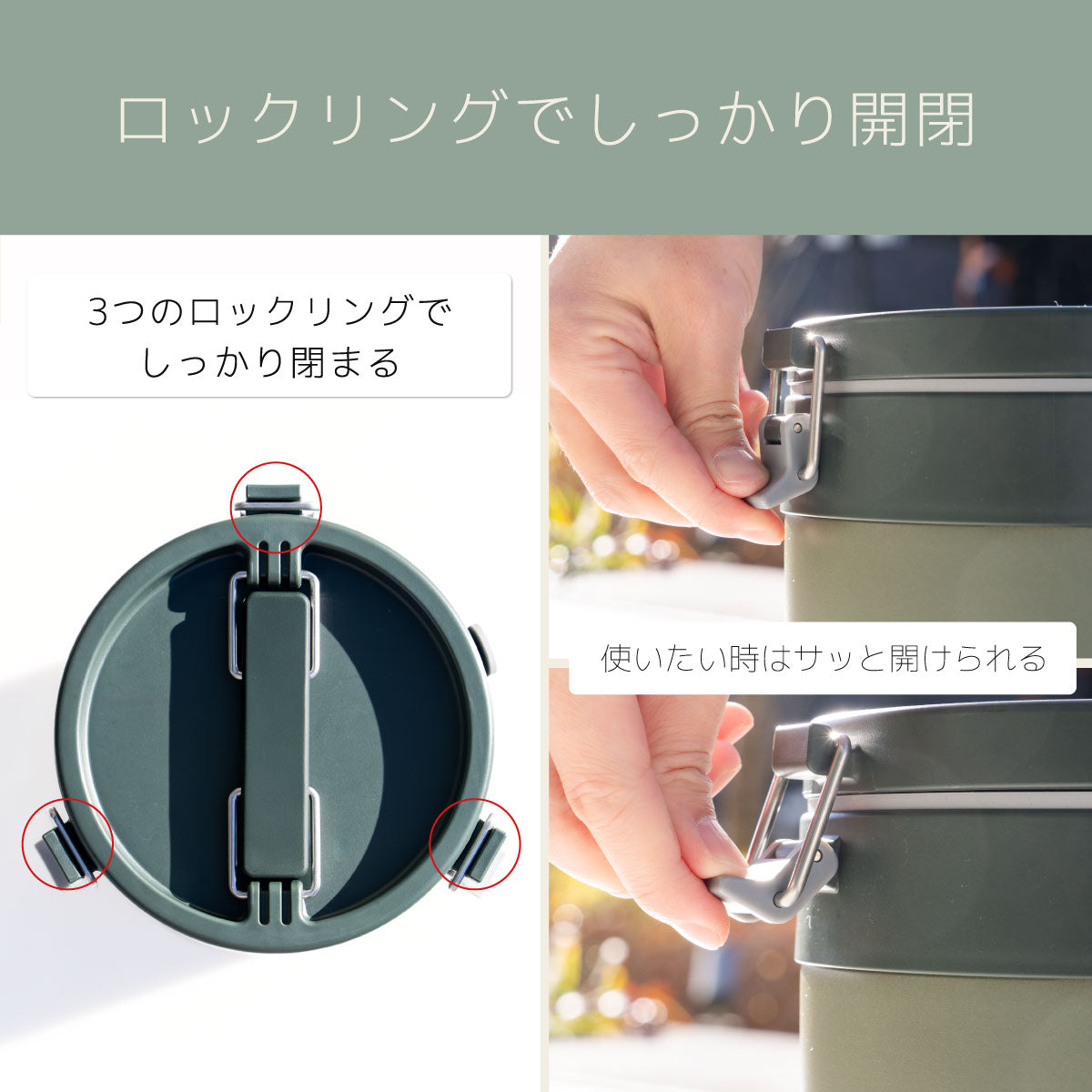 本体側面に配置した3つのロックリングにより、フタとの開閉をスムーズに行えます。しっかり閉まり、使いたいときはサッと開けられます。