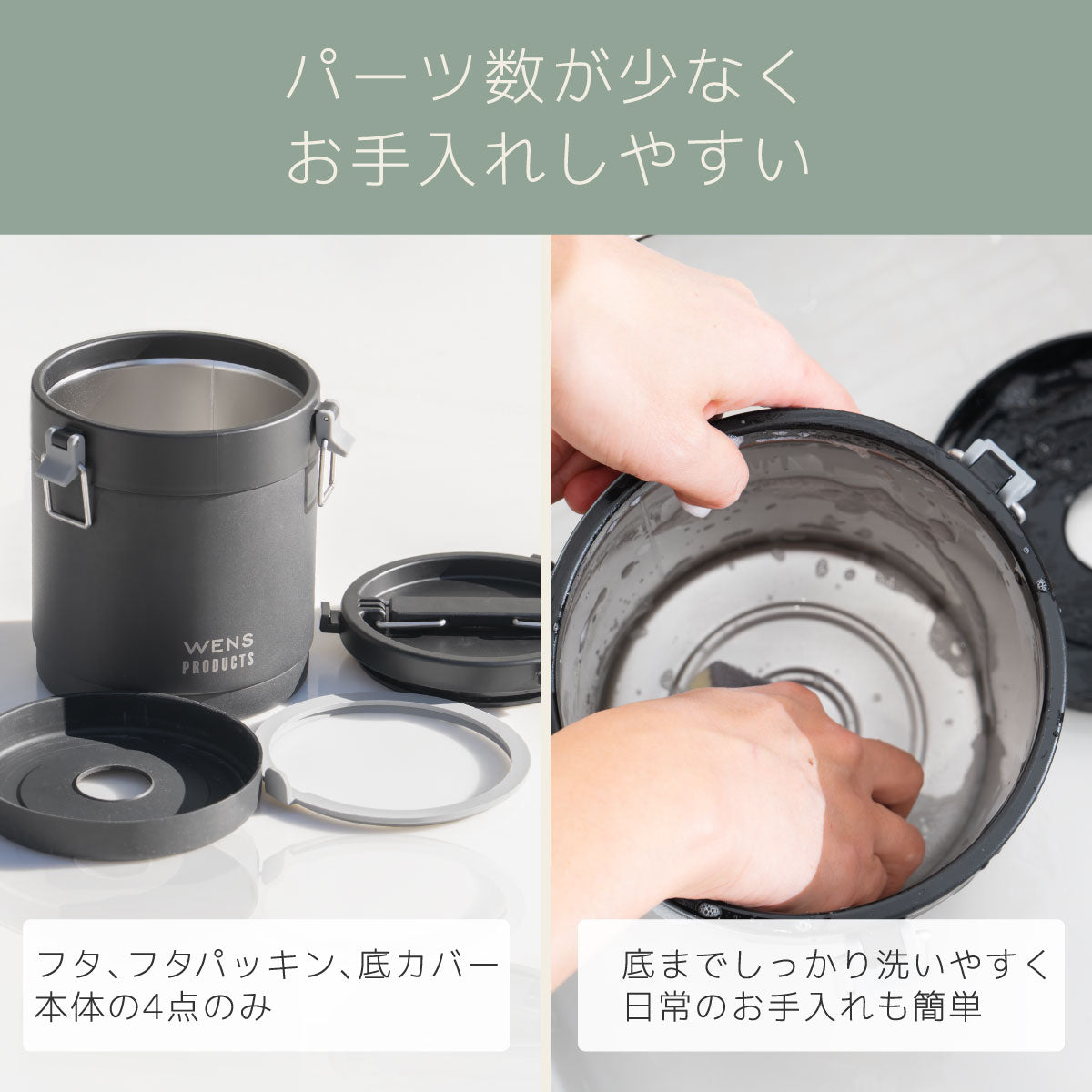 部品はフタ、フタパッキン、本体、底カバーと4点のみのシンプル構造。シリコーン製のフタパッキンや底カバーは取り外しでき、広口設計なので手を入れて底までしっかり洗いやすく、日常のお手入れも簡単です。