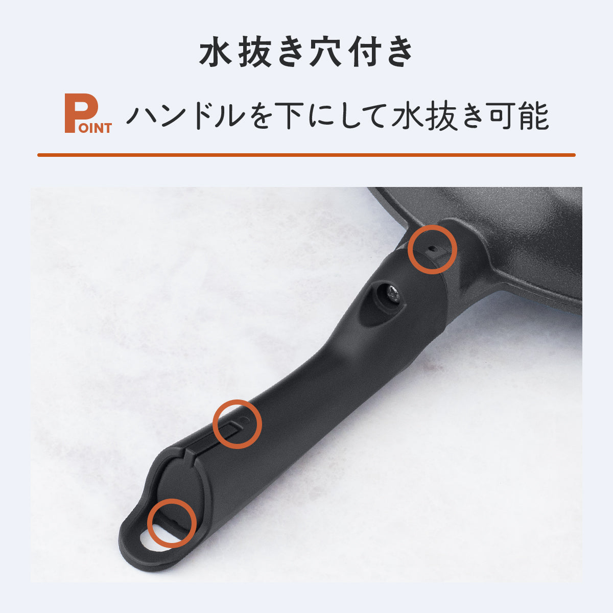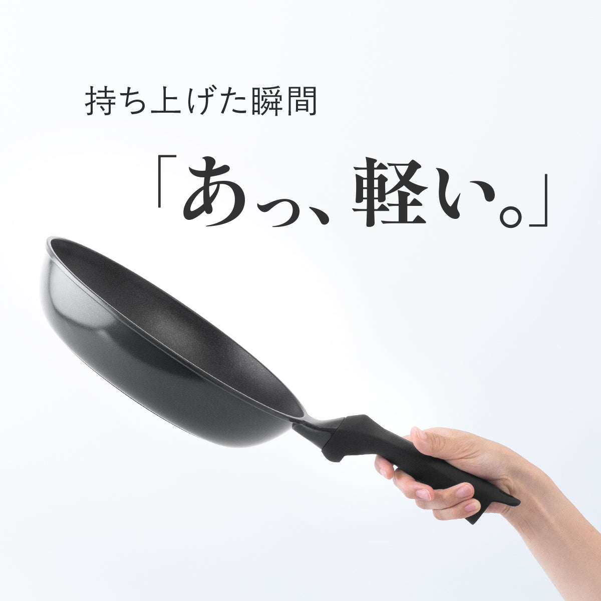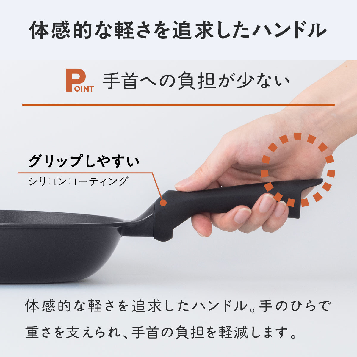 フライパンを選ぶ上で軽さは重要な要素です。しかし本体を薄くするなどして数値的な軽さを追求すると取り回しやすい反面、火加減の調整が難しくなる・変形しやすくなる・重心がハンドル側に偏りコンロから転げ落ちる危険があるなどのデメリットも生じます。本シリーズは、ほどよい重さがありながら、持ち上げた瞬間に「あっ、軽い」と感じる体感的な軽さを追求しました。ハンドルは薬指と小指、掌底部で握る部分を太くすることで、手のひらで重さを支えやすい設計に。指だけで握るよりも手首への負担を少なくしています。人差し指と親指で握る部分は細くし、自然に正しい持ち位置へ誘導するとともに、フライパンを煽る動作での手首への負担も軽減します。また、シリコンコーティングによりグリップ力を高め、軽い力でも安定した握りが可能に。さらに本体から大きく上がった位置に取り付けた「アップハンドル」は、手を火から遠ざけ調理時のやけどのリスクを軽減します。