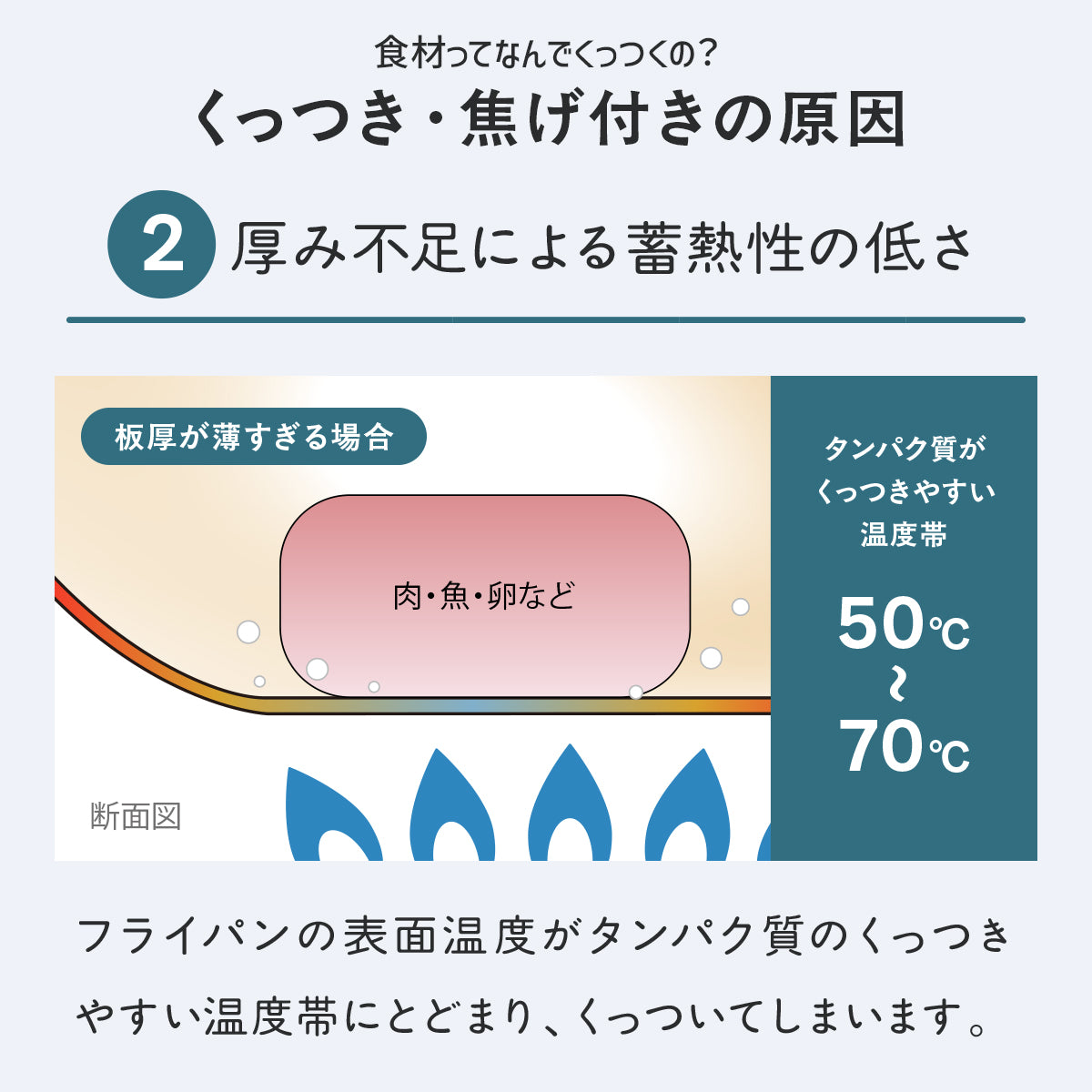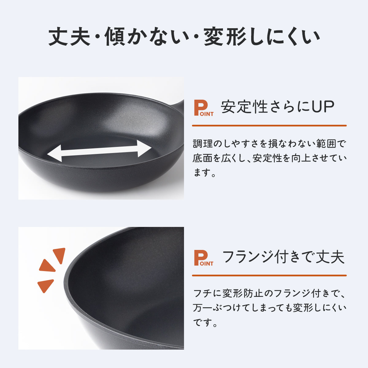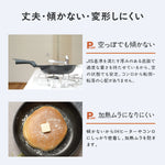 本体が薄くて軽すぎるフライパンは、重量バランスが悪くなりがちでIHヒーターやガスコンロの上で傾くことも。傾いた状態は加熱ムラの原因になるだけでなく、フライパンがコンロから転倒・転落するおそれがあるため、軽すぎるフライパンは扱いが難しいと言えます。本シリーズは安定性を重視し、空の状態でも傾かないよう、JIS基準を満たす厚みのある底面で適度な重さを持たせています。また、調理のしやすさを損なわない範囲で底面をできるだけ広くし、フチには変形を防ぐためのフランジを設けることで、安定性・耐久性を向上させています。
