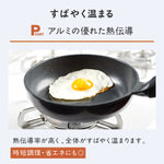 本シリーズの内面コーティングには、食材のくっつきにくさ・耐熱性・コーティングの剥がれにくさを兼ね備えたダイキン『Silkware ES』を採用しています。『Silkware ES』は、セラミック配合のプライマー/ミドルコート/高耐久トップコートの3層構造により、高い耐久性を誇ります。また、金属ヘラによる内面コーティングの耐摩耗試験では100万回の往復動作でも表面のコーティングを維持し、その耐久力を実証しました。本体はアルミの優れた熱伝導性に加えて、底面を厚くし蓄熱性を持たせているので食材が焼き固まりやすく、軽量ながらも食材のくっつきにくさがさらに長続きします。少ない油で調理することができ、スルスルと滑らせながら目玉焼きを焼いたり、羽つき餃子もすとんと綺麗に剥がすことができます。