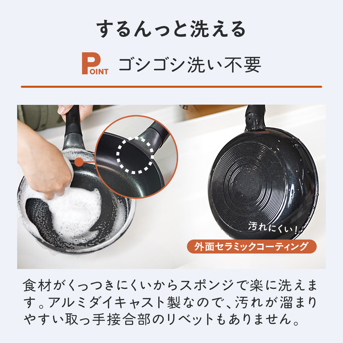 食材がくっつきにくいので洗うのも楽です。加えて、アルミダイキャスト製なので内側にリベット(取っ手接合部の金具の凹凸)が無く汚れが溜まらないため、スポンジでするんと丸洗いができます。外面は耐熱性が高く焦げ付きにくいセラミックコーティングで、焦げ付きや汚れを抑えられます。