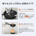 本シリーズは、コーティングへの金属ヘラによる耐摩耗試験のほか、専用の試験機による耐久試験でも高い品質を実証しています。ハンドルの強度試験では、各サイズ容量の2倍の重さを取り付けた繰り返し動作1万回でもガタつきがなく、底の平面性試験でも急激な温度変化に強く、変形しにくいことが確認されています。各試験でJIS S 2010の基準を満たしているので、正しい使用方法であれば焦げ付きや変形、取っ手のガタつきなどといった不具合が起きにくく、長く使えて経済的です。木ベラやシリコン製のヘラを使用すると、コーティングがさらに長持ちします。